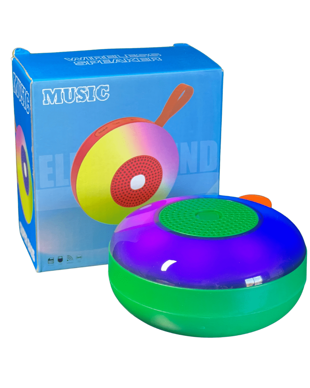 Parlante portátil inalámbrico Bluetooth con luces LED de colores. Con una batería de 1200mAh, sonido de 5W y opciones de conexión vía Bluetooth, tarjeta SD y USB. Incluye cable de carga USB. Ideal para música y ambiente con estilo.